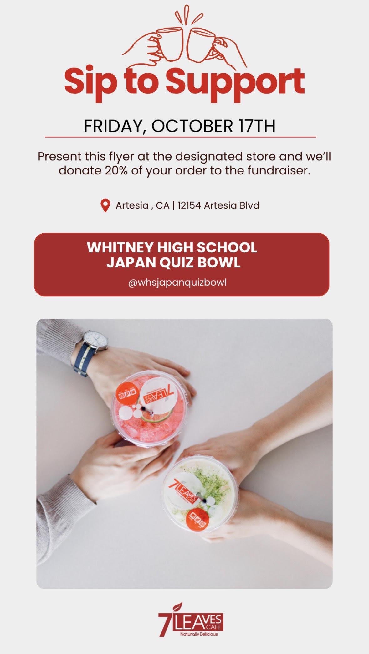 WHS Japan Quiz Bowl fundraiser at 7 Leaves Café on today from 11am - 7pm