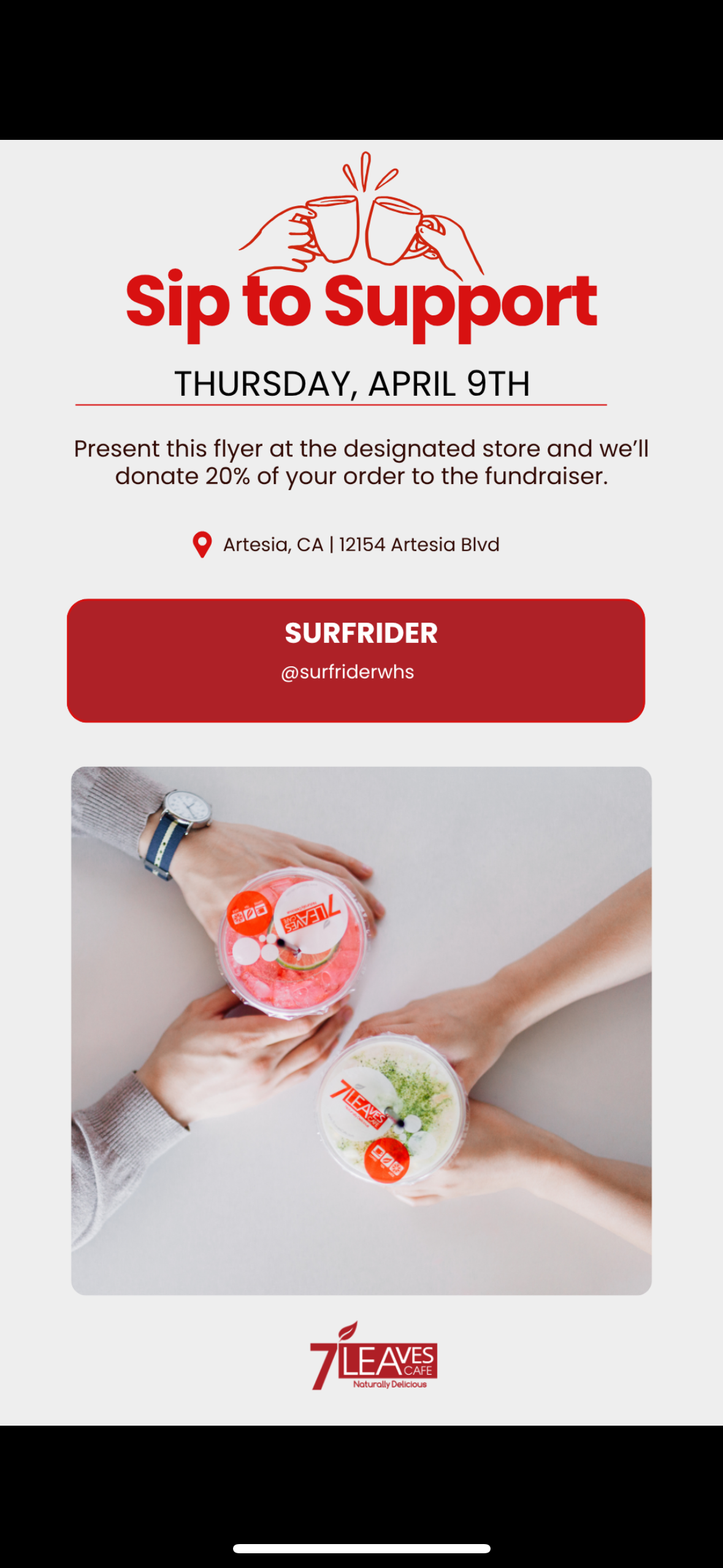 WHS Surfrider Club fundraiser at 7 Leaves Café on April 9 from 7am - 11pm